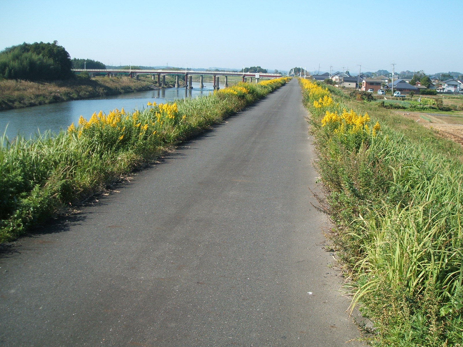 常陸太田の和田地区までは、この様に川沿いの舗装された土手をのんびりと景色を楽しみながら走ることができます。黄色い秋の野花(セイタカアワダチソウかと思います)がサイクリング道の両側に咲いており、心がなごみます。